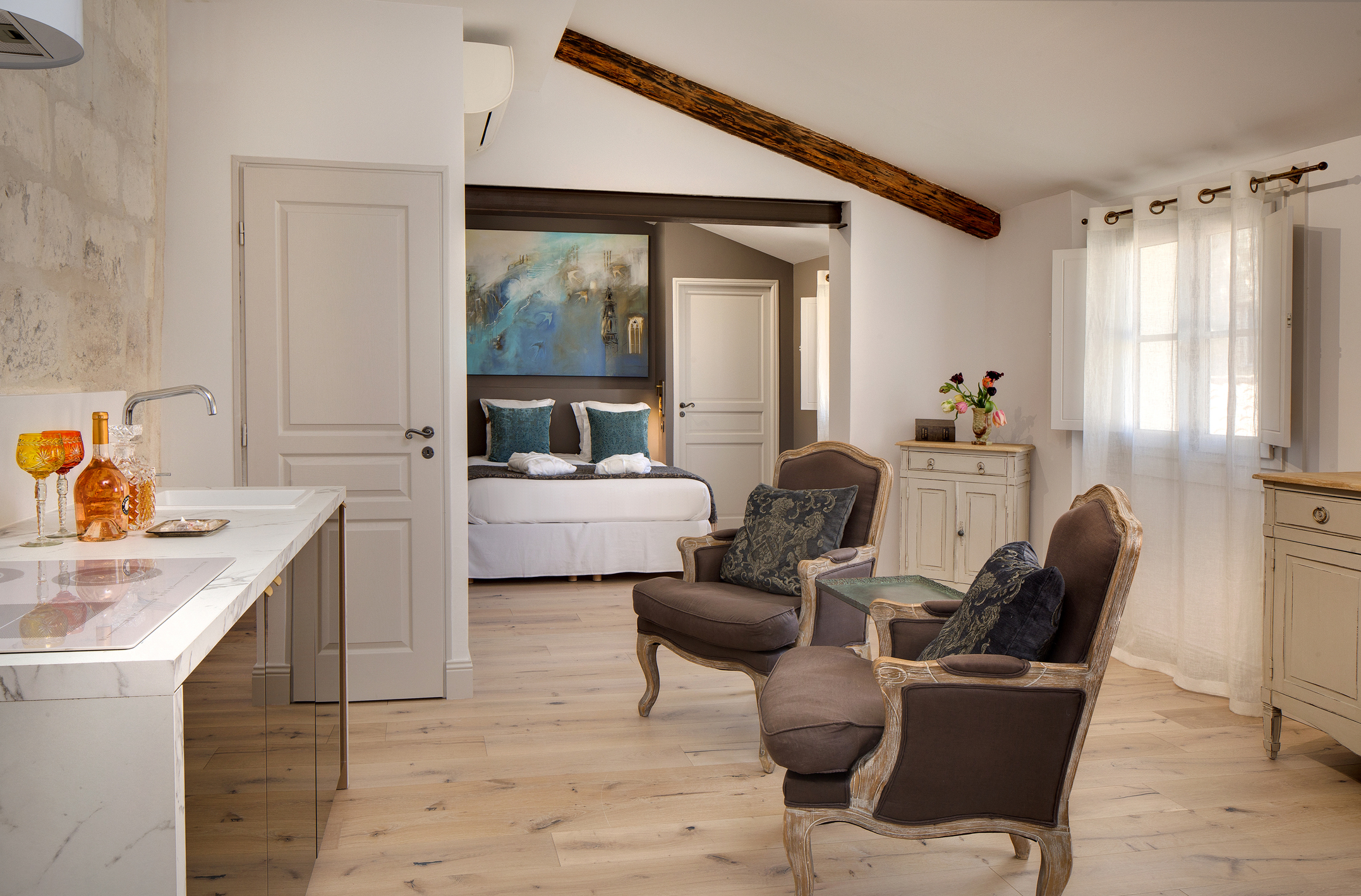 Située au deuxième et dernier étage et déployant ses 38 m² avec harmonie, la Suite Clément V s’ouvre sur le jardin patio méditerranéen, offrant une vue apaisante et une atmosphère empreinte de douceur. Ses volumes généreux et son salon indépendant en font un lieu idéal pour un séjour haut de gamme en Provence, où espace et élégance se conjuguent naturellement.