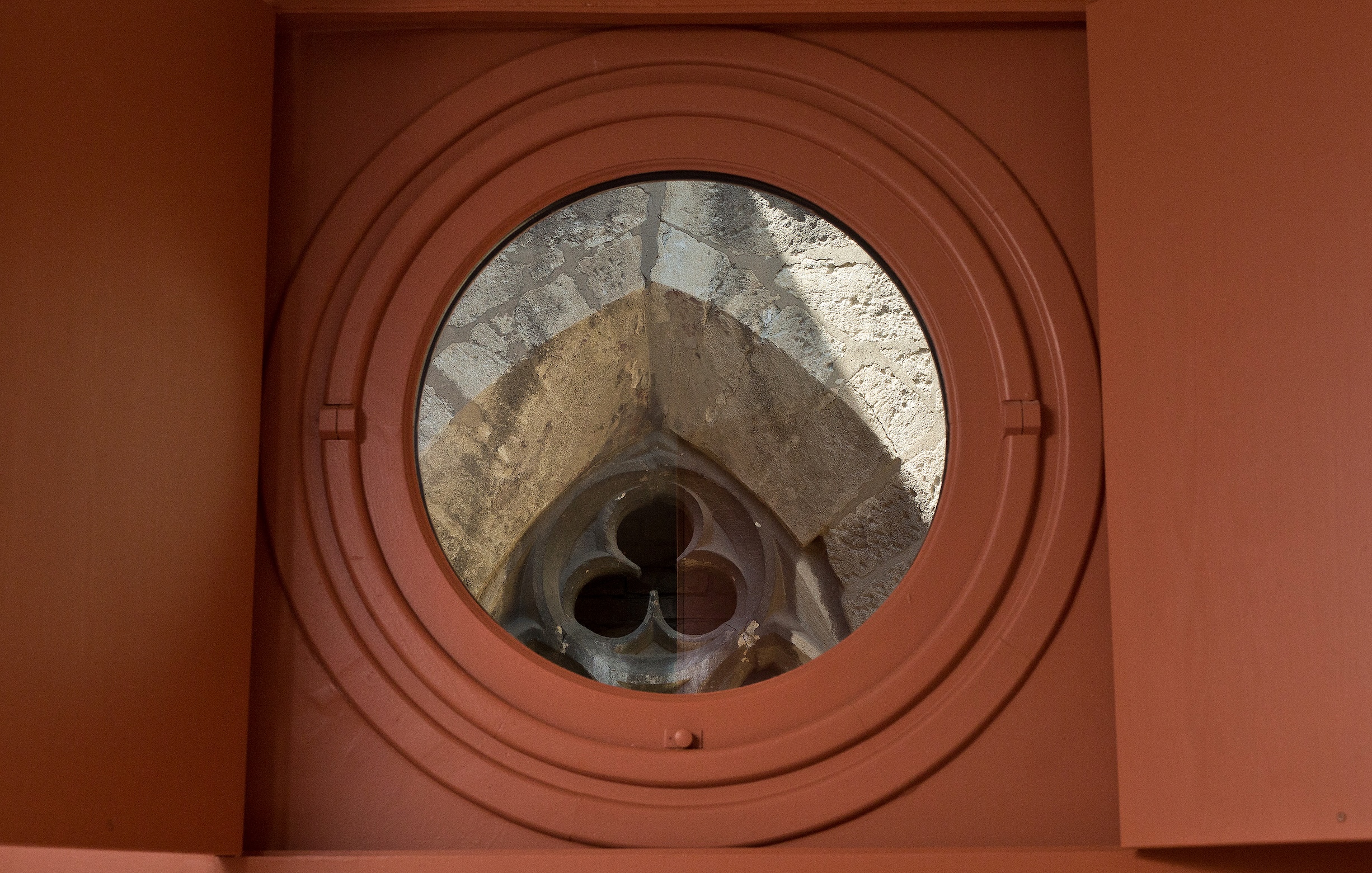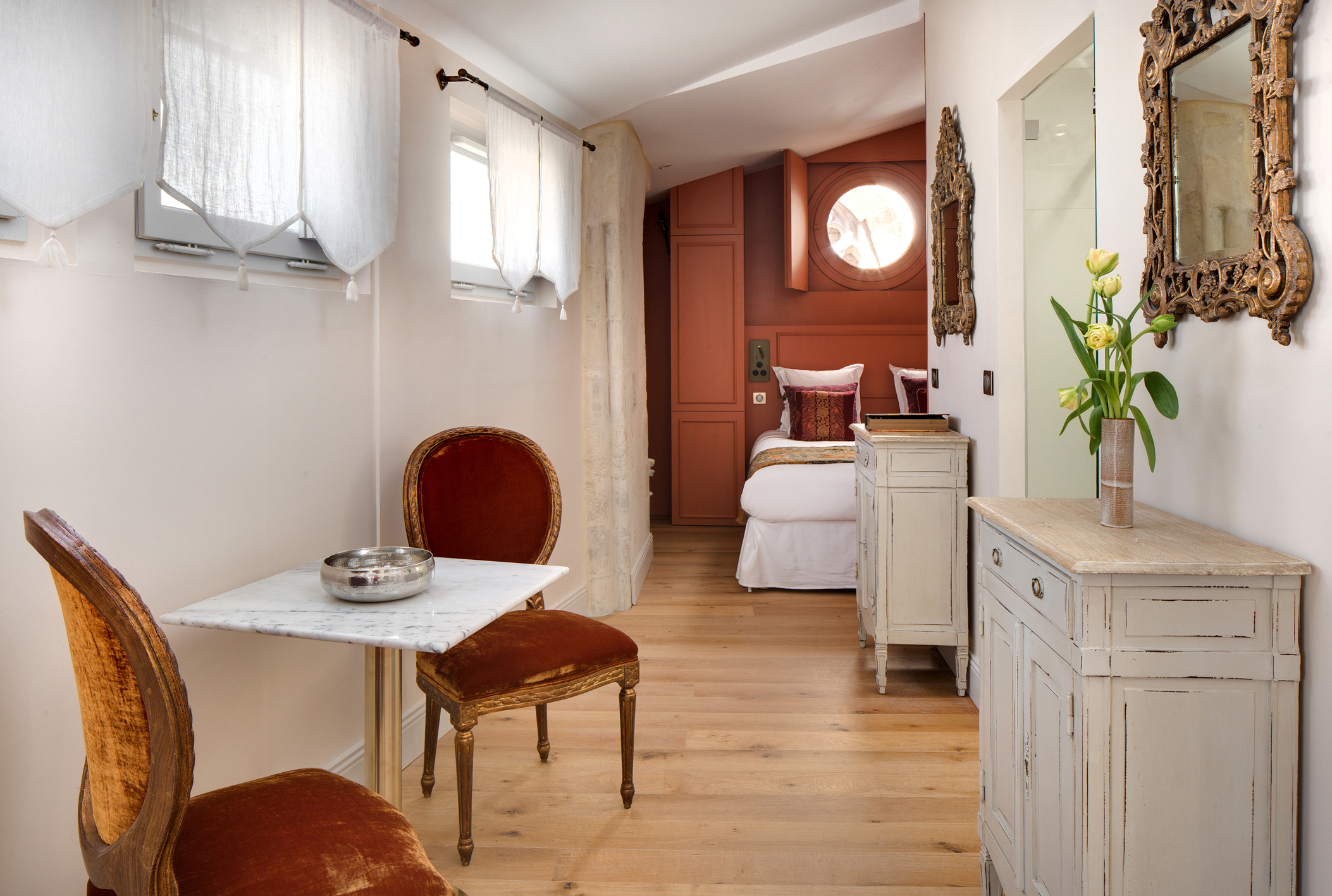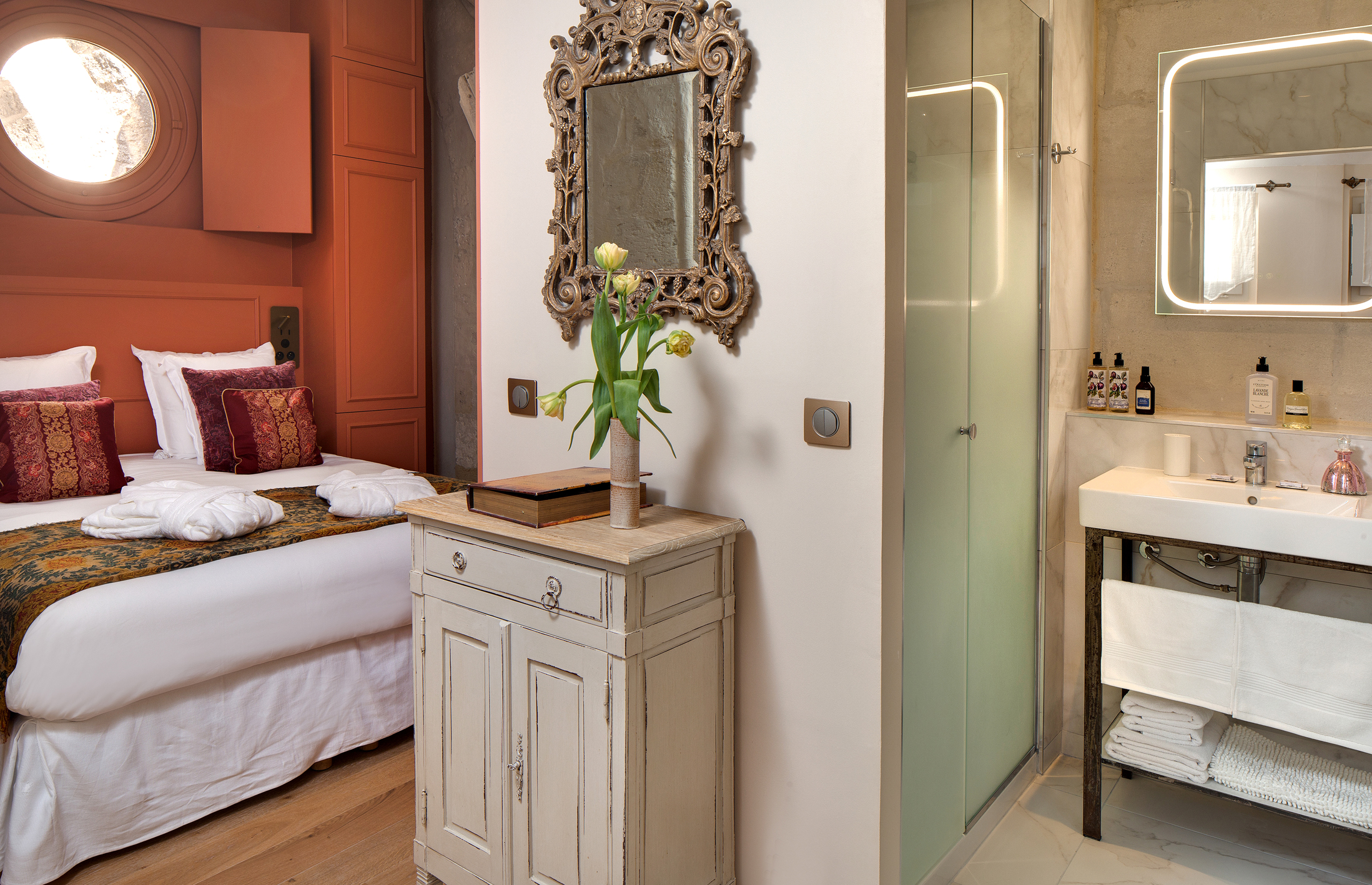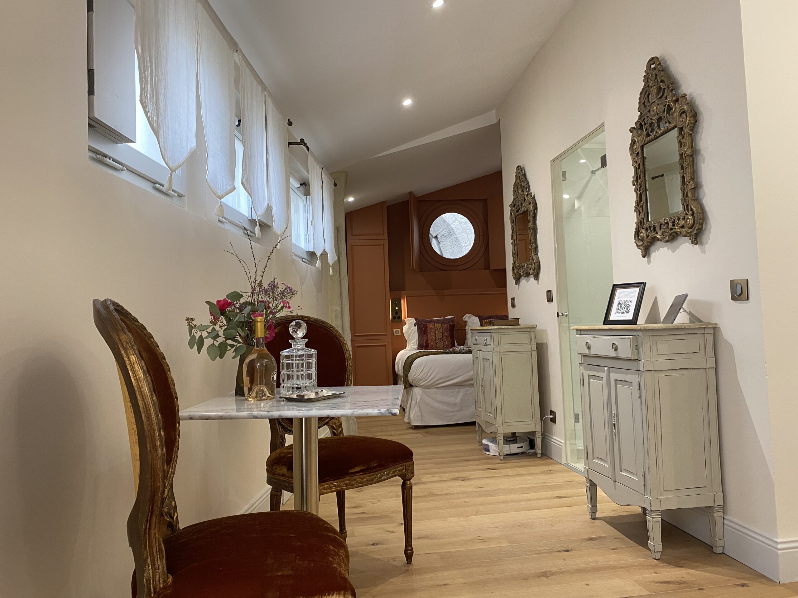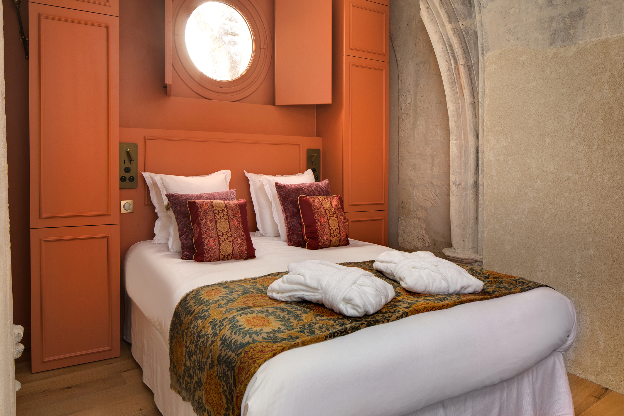 Le lit King size (160x200cm), lové dans une alcôve composée de mobilier réalisé sur mesure par un menuisier ébéniste, s’inscrit au cœur des impressionnants vestiges des départs de voûtes de l’ancienne église. Un hublot ouvre la vue sur le clocher et ses fenêtres gothiques, ajoutant au charme exceptionnel de l’appartement. Le bout de lit, réalisé dans un tissu ikat en soie fait main, s’accorde parfaitement aux teintes murales, tandis que les armoires peintes reprennent les nuances d’ocre visibles sur les vestiges anciens. Le parquet chaleureux et les volets intérieurs en bois parachèvent l’harmonie de ce lieu chargé d’histoire. Un coin salon raffiné invite à la détente, à la lecture ou à un moment de quiétude à deux. Les fenêtres, quant à elles, peuvent être occultées par des volets intérieurs en bois, typiques de notre région, détail patrimonial qui participe pleinement au charme et à l’intimité de l’appartement.