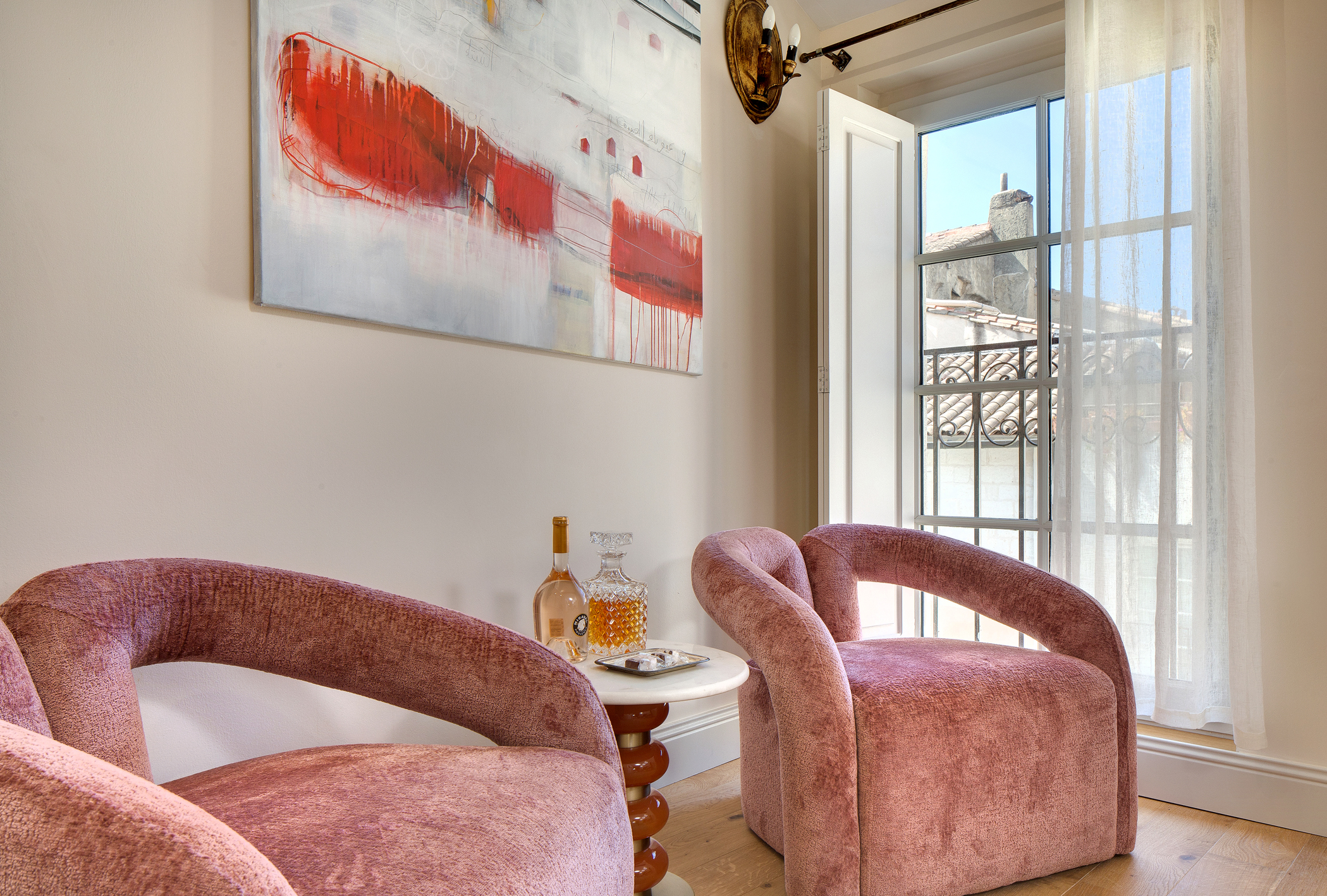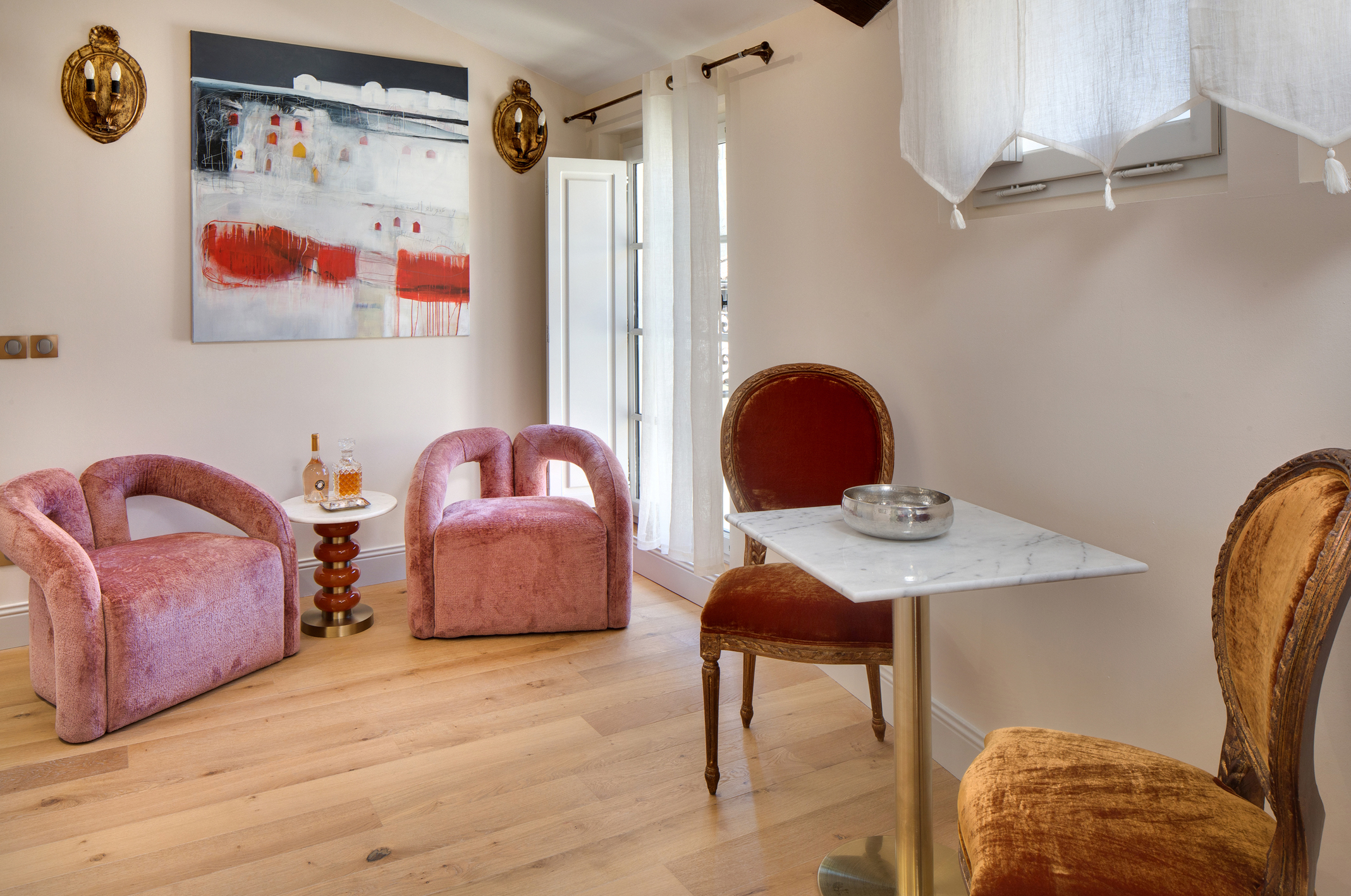 Les tons d’ocre et de rose ont été choisis pour envelopper le lieu d’une atmosphère chaleureuse, lumineuse et profondément raffinée. Les murs, habillés de la teinte Red Earth de Farrow & Ball, révèlent toute la noblesse de cet écrin singulier.